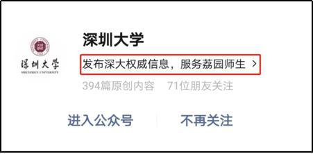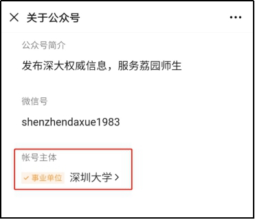方法一:查詢微信公眾號的賬號主體,賬號主體為“深圳大學”的賬號均為深圳大學的官方賬號。查詢方法如下(以“深圳大學”官方微信公眾號為例):