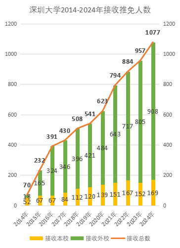 在不久前結束的2024年接收推薦免試攻讀研究生(以下簡稱推免生)招生工作中,深圳大學推免生接收人數再創新高。深圳大學接收推免生人數首次突破千人,達1077人(含直博生5人),推免生接收人數僅次于中山大學、華南理工大學,位列廣東高校第三。在今年教育部下達的任務要求中,深圳大學的優秀本科畢業生推薦(保研)指標為385個,深圳大學實際完成接收人數為推薦指標的280%,圓滿并超額完成該任務,其接收推薦比連續十年蟬聯廣東省高校第一寶座。