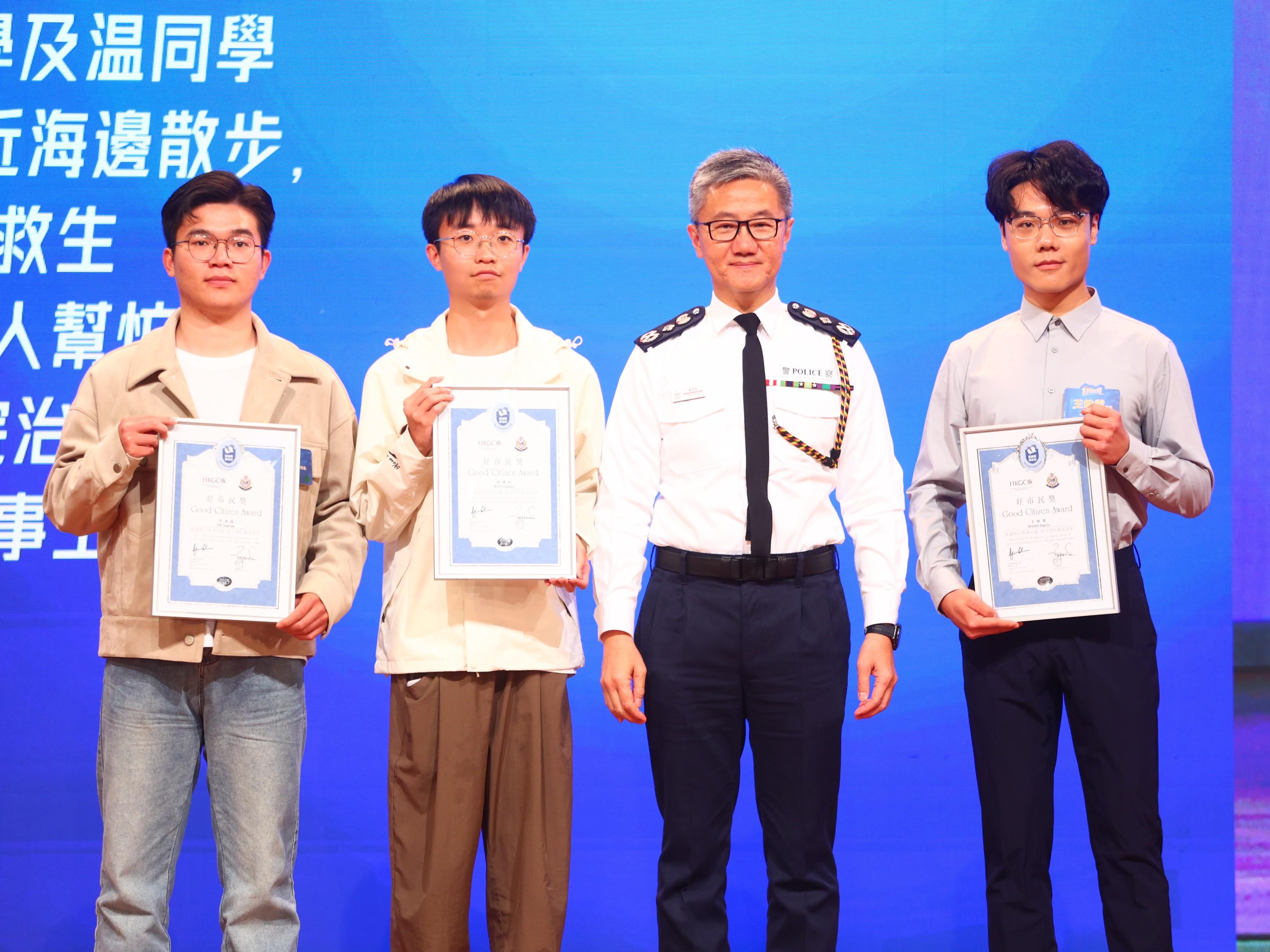 在典禮現場,何金淼、王皓霖、溫建彬三位同學接受了香港警務處處長蕭澤頤的頒獎。