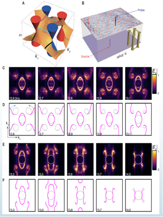 最近,英國伯明翰大學(xué)張霜教授課題組與深圳大學(xué)范滇元院士團(tuán)隊先進(jìn)材料光子學(xué)課題組、University of Exeter和中科院物理合作,設(shè)計并制備了馬鞍形狀的光子晶體(圖1A,B),觀測到了理想的外爾系統(tǒng),其中四個對稱性保護(hù)的外爾點坐落在同一個頻率,并且在這個頻率周圍沒有其他能帶干擾(圖1C)。他們采用近場掃描的方法測量了該光子晶體的體態(tài)和表面態(tài)的分布情況(圖2)。作為源的探針放在樣品的底部,這樣可以同時激發(fā)體態(tài)和表面態(tài)。測量的探針在樣品的上表面掃描,可以得到近場的振幅和相位分布,然后通過傅里葉變換得到其動量空間的等頻面分布情況。從圖中的實驗和仿真的對比中可以看到螺旋表面態(tài)的旋轉(zhuǎn)情況。他們的發(fā)現(xiàn)對外爾拓?fù)鋺B(tài)的研究提供了一個理想的平臺。