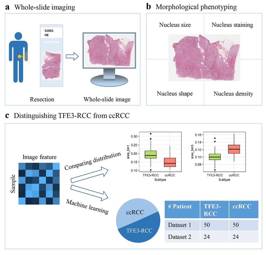 TFE3 Xp11.2 translocation renal cell carcinomaTFE3-RCC)是一種罕見的腎細胞癌,相較于其他腎細胞癌亞型,其惡性程度更高,但臨床診斷過程中病理醫(yī)生很難通過常規(guī)的H&E染色病理切片將TFE3-RCC與其他腎細胞癌亞型區(qū)分,而是需要借助其他操作更為復雜的方法如熒光原位雜交進行鑒別診斷。該研究基于常規(guī)的H&E染色病理切片,收集了迄今為止樣本量最大的TFE3-RCC數(shù)據(jù)集,設計開發(fā)了一種利用計算機自動分析數(shù)字病理圖像的分析方法(圖1),尋找對TFE3-RCC和透明細胞腎細胞癌(最常見的腎細胞癌,約占75%)具有顯著鑒別能力的細胞形態(tài)學特征,并利用機器學習的方法對這兩種類型的癌癥進行自動區(qū)分。在獨立的驗證集上,該研究所提出方法的分類性能可達ROC曲線下面積0.894