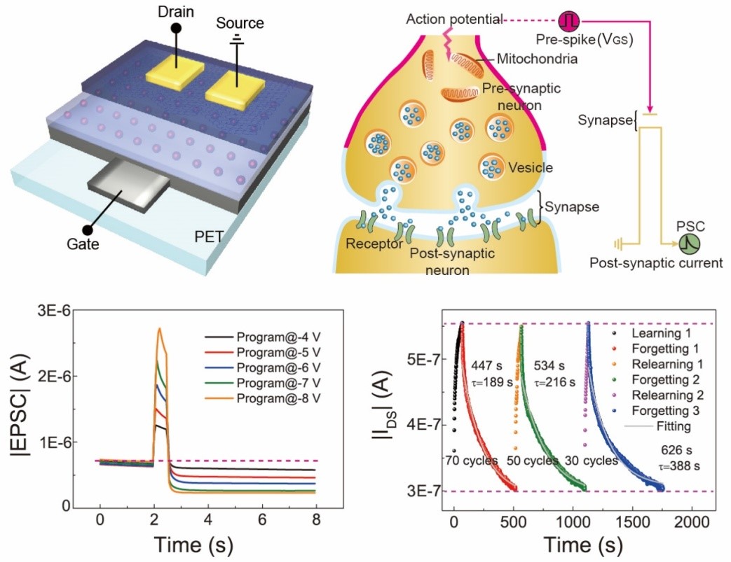 基于能驅動處理大量信息的高度連通性的生物神經形態系統,晶體管的人工突觸有望克服神經形態計算的馮諾依曼瓶頸。在這項工作中,課題組首次使用C60 /PMMA雜化層驗證了能夠同時表現出信號傳輸和學習功能的人造有機柔性突觸晶體管。通過簡便的溶液工藝在PMMA中摻雜C60捕獲位點以形成混合結構。柔性的突觸晶體管具有2.95V的存儲窗口,大于1000的開關比,編程/擦除耐受性周期超過500次。此外,本工作使用三端口晶體管模擬了多種生物突觸功能,包括在不同脈沖持續時間,脈沖幅度和溫度條件下的后突觸電流,成對脈沖促進/抑制,溝道電導增強和抑制的連續調制,從短期可塑性到長期可塑性的轉變以及重復性的學習與遺忘過程。具有低操作電壓和可控電荷捕獲極性的C60突觸晶體管的實現是使用有機電子器件進行未來神經形態計算的重要一步。