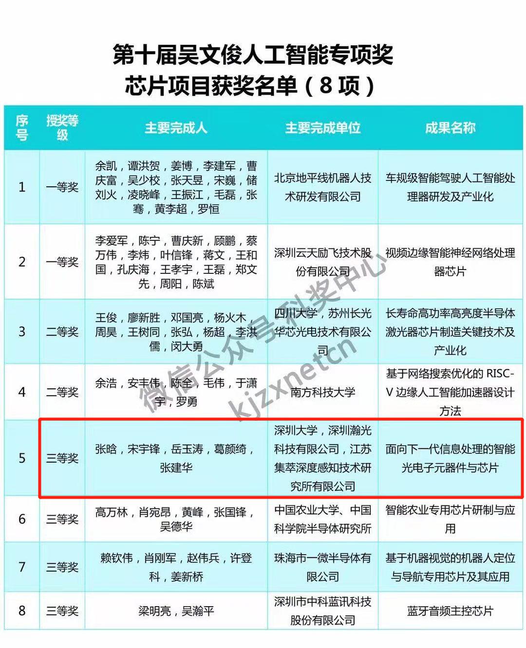 經全國各地方人工智能學會、協會及聯盟,各高校及科研(院)所,學會各專業委員會及工作委會,各團體會員(企業)單位和兩院院士、學會會士等專家學者的提名推薦,吳文俊人工智能科學技術獎辦公室通過對提名項目進行網絡評審、會議初評和終評答辯,最終對100個成果授獎。我校獲獎項目“面向下一代信息處理的智能光電子元器件與芯片”,微納光電子學院教授張晗為第一完成人,電子信息工程學院助理教授宋宇鋒為第二完成人。