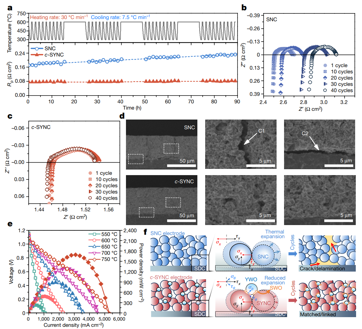 該研究首次提出“負熱膨脹補償調節”概念,建立了負膨脹材料-鈣鈦礦界面機械錨固力學平衡效應模型,分析了負膨脹材料與鈣鈦礦材料原位反應界面錨固效應強化機理,并有效復合負膨脹材料與鈣鈦礦材料,成功降低復合材料電極的熱膨脹系數,優化電極-電解質材料界面,克服了固體氧化物電池電極-電解質界面熱膨脹系數不匹配的難題。研究發現,電極熱膨脹系數的降低、鈣鈦礦相結構優化和熱機械穩定性提升的協同作用共同促進了這種復合電極的出色電化學性能,該成果為團隊正在攻關的“零碳排放直接煤固體氧化物燃料電池”新型高性能電極材料的開發提供了堅實的技術支持與保障。