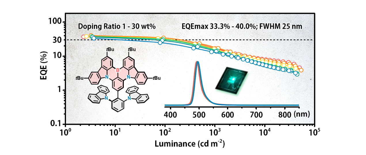 近日,深圳大學(xué)材料學(xué)院楊楚羅特聘教授團(tuán)隊采用在多重共振熱激活延遲熒光分子的外圍引入“擋板”基團(tuán)(圖示分子灰色片段),將多重共振母核(圖示分子粉色片段)包裹在中間的策略,實現(xiàn)了窄發(fā)射光譜并抑制聚集誘導(dǎo)發(fā)光猝滅的目的。相應(yīng)OLED器件性能獲得大幅提升,在摻雜濃度為1-30%的區(qū)間內(nèi)光譜幾乎無變化,發(fā)光半峰寬僅為25納米;在5%摻雜濃度下OLED器件實現(xiàn)了40%的發(fā)光效率,創(chuàng)造了目前國際上窄發(fā)射OLED器件效率的紀(jì)錄,在產(chǎn)業(yè)上有潛在的巨大應(yīng)用價值。