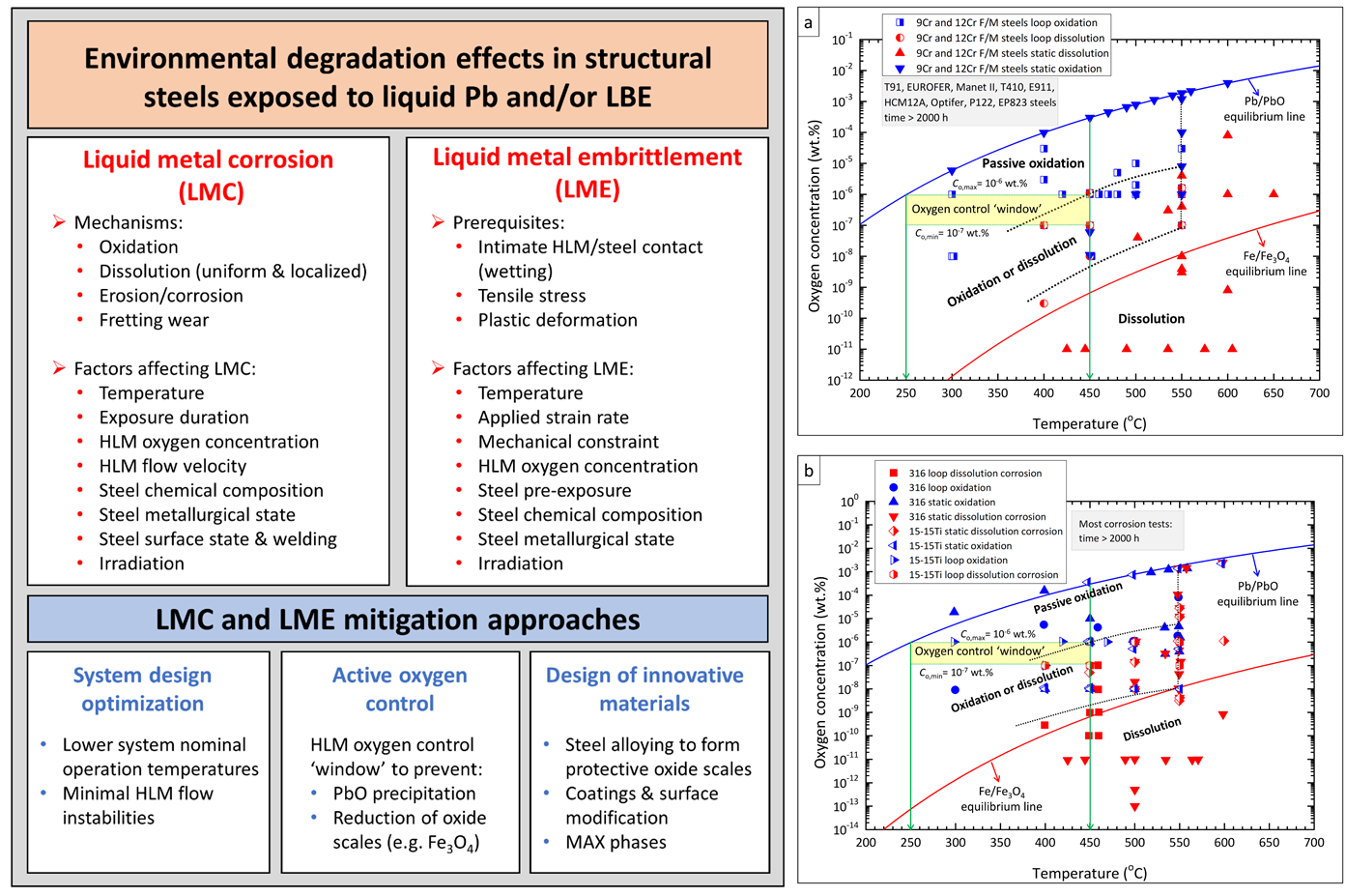 圖1結構材料在鉛和鉛鉍環境中面臨的主要性能環境退化效應、抑制技術手段和氧控邊界