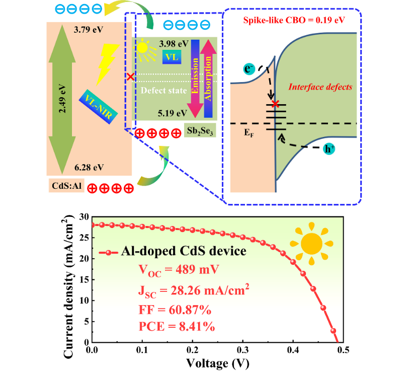 課題組提出了一種異質結界面優化策略,通過在CdS緩沖層中引入Al3+離子并進行熱處理,Sb2Se3/CdS:Al異質結的能帶排列可有效地由“懸崖狀”結構轉變為理想的“長釘狀”結構,從而降低異質結界面缺陷濃度,抑制載流子非輻射復合,提高太陽電池性能;最后總結分析Sb2Se3薄膜太陽電池載流子動力學優化機制對太陽電池效率進一步提升具有重要意義。相關研究成果發表在Advanced Functional Materials (2023) 2213941(影響因子:19.924),梁廣興和陳爍為論文通訊作者,其指導的聯合培養博士研究生羅燕娣為第一作者,深圳大學為唯一通訊單位。