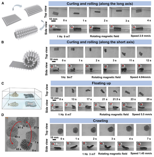 在自然界中,眾多陸生動物和昆蟲的腿部結構使其在行進或奔跑時能夠減少摩擦、增加運動自由度并有效降低能量消耗。基于對這一生物學特性的研究和模仿,科學家們開發了多軟足微型機器人,這種機器人設計能夠適應胃腸道等人體內復雜地形,并減少與組織表面的附著力(Shen and Wang et al., Nat. Commun. 2018, 9, 3944)。借助于精確控制的磁驅動單元,這些多足機器人能夠進行形變,從而展現出多種運動模式,如沿不同軸向的卷曲、類似于潛艇的垂直浮動,以及周期性的爬行等。