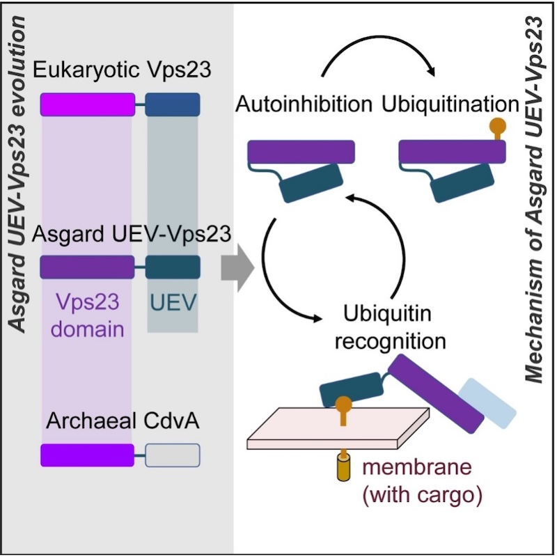 李猛教授研究團隊以阿斯加德古菌ESCRT核心功能亞基UEV-Vps23為研究切入點(圖1),發現該亞基的蛋白結構域包括UEV和Vps23 domain;其中UEV介導該亞基識別古菌泛素分子,Vps23 domain可被古菌泛素修飾系統標記修飾,并且UEV和Vps23 domain通過相互作用使該亞基呈現的自抑制狀態,可能是調節阿斯加德古菌ESCRT和泛素修飾系統之間功能協作的重要分子基礎。此外,研究團隊首次提出阿斯加德古菌UEV-Vps23可能起源于基因融合,該亞基是古菌CdvA向真核生物Vps23演化的“過渡版本”,進而為阿斯加德古菌向真核生物演化過程中新基因起源模式提供科學依據。