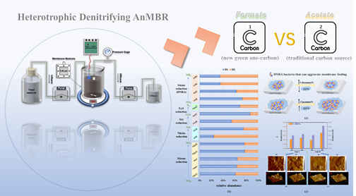 這項研究中發現了甲酸鹽可以由二氧化碳生產得來,在實驗室規模下具有良好的異養反硝化潛力。甲酸鹽進料的AnMBR表現出顯著的TN去除率,具有更多的DEN基因和更多的CAZymes來降低膜污染(Candidatus Cloacimonadota、Azospirillu物種豐度顯著增加)。然而,乙酸鹽進料的AnMBR以Anaerolineae和Lentimicrobium屬為主,具有較多的DNRA基因和EPS生物合成基因,這可能導致在出水中NH4+-N的出現和更嚴重的膜污染。未來還將在類似的廢水處理中使用全/中試規模的膜,以更好地彌合本研究中實驗室規模的膜的結果與實際應用之間的差距。