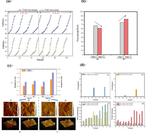 圖2(a)AnMBR在操作過程中的TMP變化;(b)污泥粘度變化;(c)膜表面的AFM表征;(d)EPS濃度變化(D1:甲酸鹽進料;D2:乙酸鹽進料)