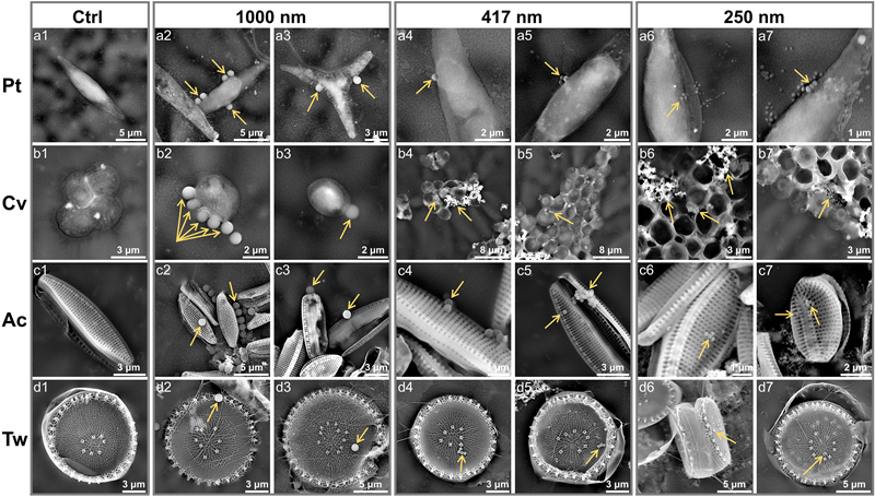 微塑料帶來的海洋污染對浮游植物構成重大威脅,但目前人們對微塑料與微藻細胞之間的物理相互作用仍知之甚少。該研究使用原子力顯微鏡探索了經海水老化的微塑料與四種代表性微藻的接觸模式。共暴露七天后,微藻的特定部位出現了因物種和微塑料粒徑而異的畸形。通過鑲嵌或內陷的方式,微塑料可分別吸附于多孔或光滑的細胞表面,從而導致細胞壁出現輕微形變或明顯皺褶。此外,微塑料甚至可侵入微藻細胞體內,但這種現象在典型硅藻中較少出現,因為硅藻外殼具有能“捕獲”微小顆粒的分層多孔結構。該工作首次在納米尺度上揭示了由微塑料導致的物種特異性微藻表面形變。