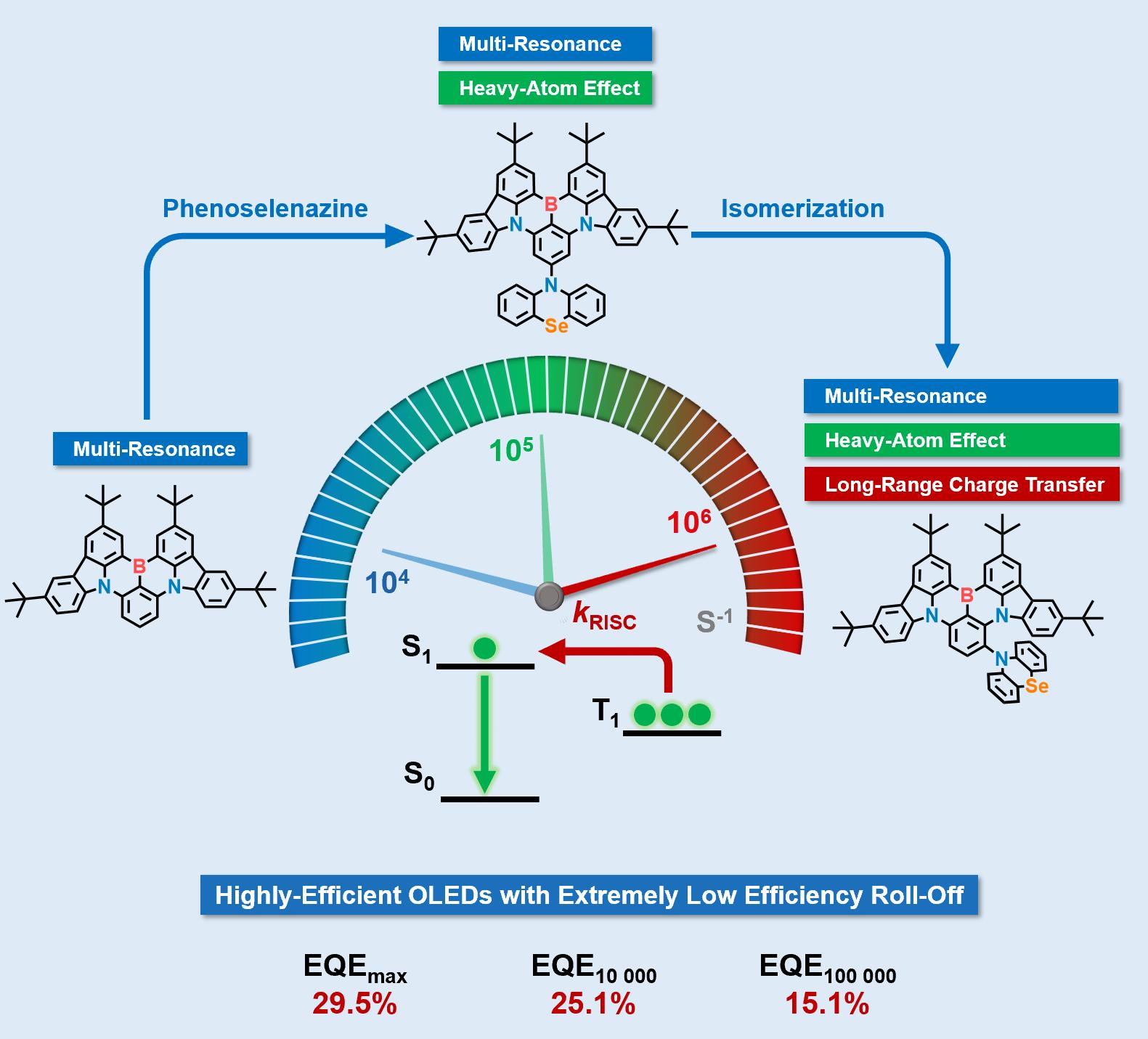 前沿OLED應用場景,諸如虛擬現實、透明顯示需要在高亮度(超過10,000尼特)下工作,這對高亮度水平下的電致發光器件外量子效率(EQE)提出了高要求,甚至超越了最大外量子效率本身的重要性。為了在高亮度下實現高效的電致發光,發光材料需要兼具高激子利用率和短激子壽命。近年來,多重共振(multi-resonance, MR)熱活化延遲熒光(thermally activated delayed fluorescence, TADF)分子因其兼具窄譜帶發射和高光致發光量子效率(PLQY),成為未來高清顯示OLED中極具前景的發光材料。TADF發光材料的反向隙間竄躍速率(kRISC)對于實現具有低效率衰減的高性能OLED至關重要,然而,MR-TADF發光材料固有的、原子定域化的分子前線軌道分布特性通常導致其反向隙間竄躍過程較慢,使得其相應器件在高亮度下效率滾降明顯。因此,設計具有高隙間竄躍速率(kRISC)的MR-TADF材料具有重要意義。2022年,楊楚羅教授團隊已報道了通過在MR分子骨架中引入重原子硒以增強SOC,提升MR-TADF材料kRISC的方法(Nat. Photonics2022,16, 803-810)。隨后,楊楚羅教授團隊又于2023年報道了通過在MR骨架外圍修飾電子給體,引入長程電荷轉移激發態提升MR-TADF材料kRISC的方法(J. Am. Chem. Soc.2023,145, 12550-12560)。但總的來看,與基于重金屬銥和鉑配合物的傳統磷光器件相比,MR-TADF材料的滾降仍然較大,亟待開發更加有效的提升MR-TADF反向隙間竄躍速率的方法。
