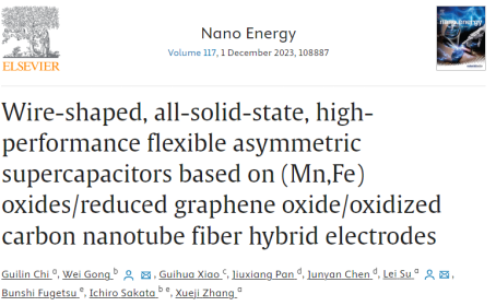 近日,深圳大學醫學部生物醫學工程學院蘇磊教授和日本東京大學工學院龔偉研究員在Elsevier期刊Nano Energy(影響因子17.6,中科院一區,TOP期刊)上發表了題為“Wire-shaped, all-solid-state, high-performance flexible asymmetric supercapacitors based on (Mn,Fe) oxides/reduced graphene oxide/oxidized carbon nanotube fiber hybrid electrodes”的研究論文。醫學部碩士生遲貴林為第一作者,蘇磊教授、龔偉研究員為共同通訊作者,深圳大學為第一單位。