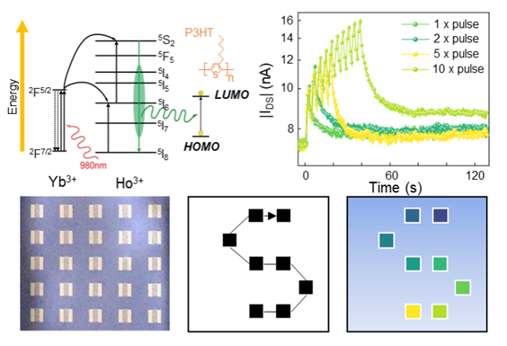 通過傳感器內計算開發能夠檢測和識別運動目標的神經形態硬件是構建分布式計算邊緣計算系統的重要組成部分。除了對可見光的反應外,神經形態硬件還應具有感知和處理非可見光的能力,這對于在特殊環境中跟蹤目標物體軌跡至關重要。通過將摻雜的LaF3: Yb/Ho上轉換量子點(UCQDs)加入到基于聚3-己基噻吩(P3HT)的有機場效應晶體管(FET)的通道中,制備了具有近紅外(NIR)響應的有機突觸晶體管,作為電荷捕獲和紅外傳感位點。所獲得的突觸晶體管不僅復制了近紅外光照下常見的突觸行為,而且還展示了在黑暗條件下動物動態軌跡識別的潛在應用。與其他監測技術相比,摻有LaF3: Yb/Ho UCQDs的P3HT晶體管在近紅外響應、高效計算和靈敏度等方面具有明顯的優勢,為今后的研究提供了實驗基礎,為下一代智能動態圖像識別系統的開發提供設計參考。此項研究得到國家自然科學基金、英國皇家化學會、射頻異質異構集成全國重點實驗室自主課題、廣東省基礎與應用基礎研究基金、深圳市科創局、深圳大學與臺北科技大學2024年合作研究的資助。