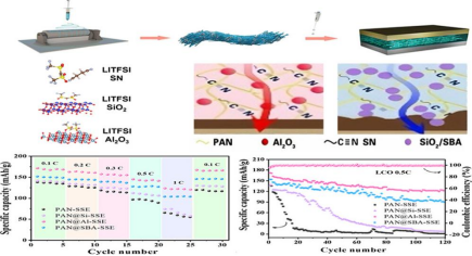 納米纖維和聚合物電解質的制備合成示意圖和丁二腈基固態鋰電池的性能測試圖