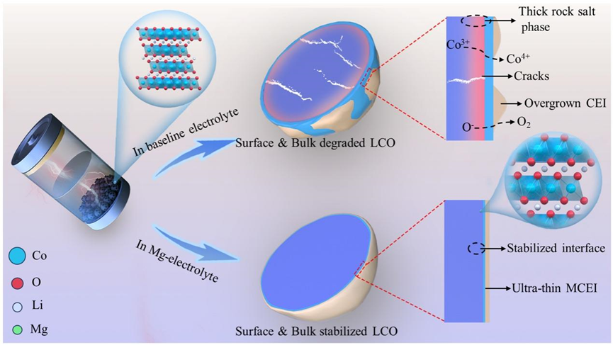 在該項工作中,通過加入Mg(TFSI)2作為電解質添加劑,構建具有物理和化學穩定性的正極-電解質界面(MCEI)。在電池活化過程中,MCEI在LCO表面快速生長形成,并在長期循環過程中始終保持2 nm的厚度。通過系列高分辨測試表征,Mg不僅僅參與了MCEI的形成和構建,而且能夠嵌入LCO的表面晶格。因此,這種超薄且機械穩定 的MCEI能夠顯著抑制界面副反應、表面相重構、顆粒開裂、鈷溶解,使得Li||LCO紐扣電池在4.5 V充電截止電壓下循環200次后容量保留88.13%,Ah級Graphite||LCO軟包電池300次循環后容量保留90.4%。