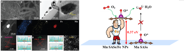 該工作合成了鐵納米顆粒@碳納米管負載的錳、鐵雙單原子位點催化劑,并證明了在碳納米管壁上的Mn單原子位點與限域在碳納米管空腔內的鐵納米顆粒存在電子授受作用,引起Mn單原子位點的姜-泰勒畸變,激活了Mn單原子位點的ORR活性。
