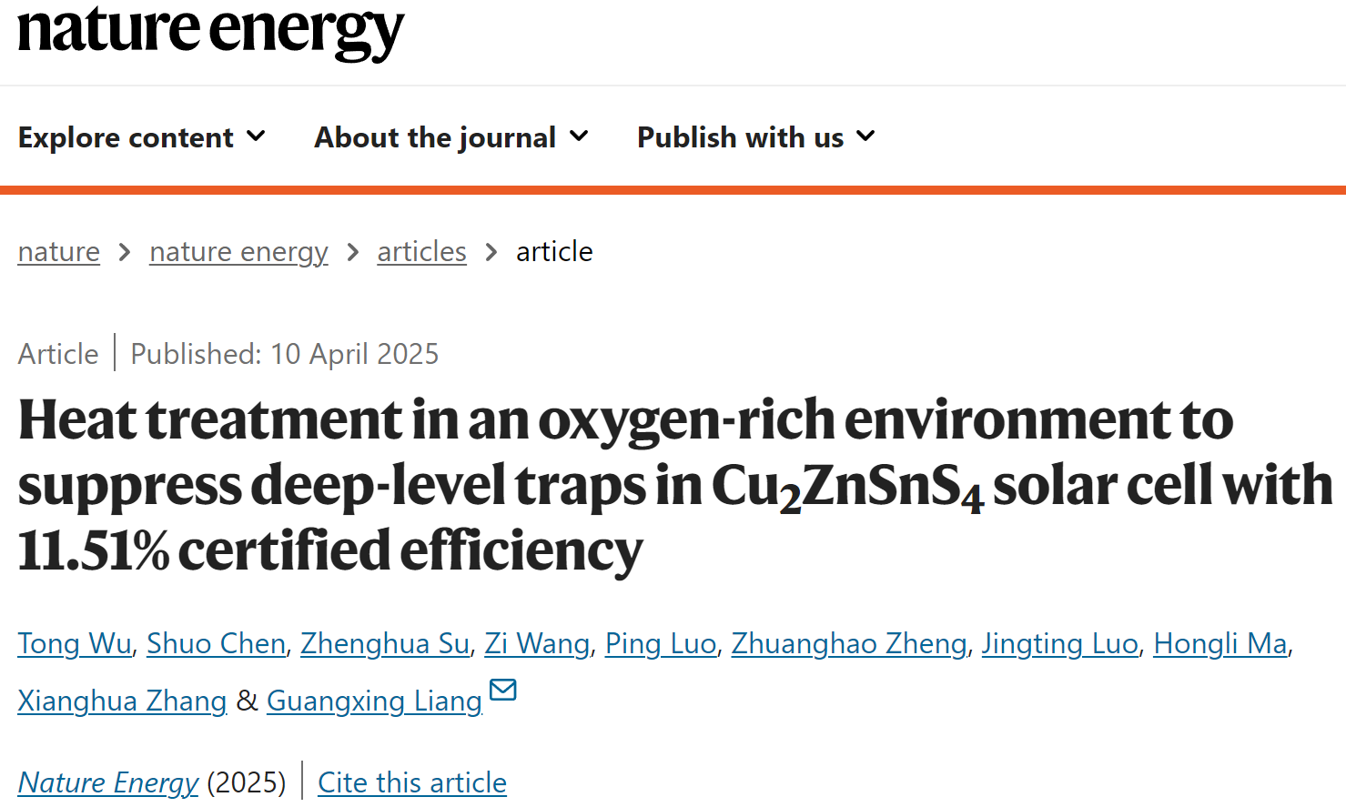 2025年4月10日,深圳大學物理與光電工程學院/薄膜物理與應用研究所梁廣興研究員及其團隊在能源領域排名第一的Nature Energy期刊(五年平均影響因子62.4)上發表題為:Heat treatment in an oxygen-rich environment to suppress deep-level traps in Cu2ZnSnS4solar cell with 11.51% certified efficiency的最新研究論文,將銅鋅錫硫化合物薄膜太陽電池的光電轉換效率提升至11.51%,刷新了目前已報道的最高效率記錄,標志著團隊在代表性環境友好型全無機化合物薄膜太陽電池方向的研究正式邁入國內外領先行列。