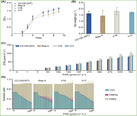 該研究進一步探究了病毒衍生的復制元件在萊茵衣藻中是否表現出毒性問題。研究發現病毒復制元件并未影響萊茵衣藻的生長、生物量積累和光合作用特性(圖4),這表明病毒衍生的復制元件與作為宿主的萊茵衣藻細胞具有良好生物相容性。