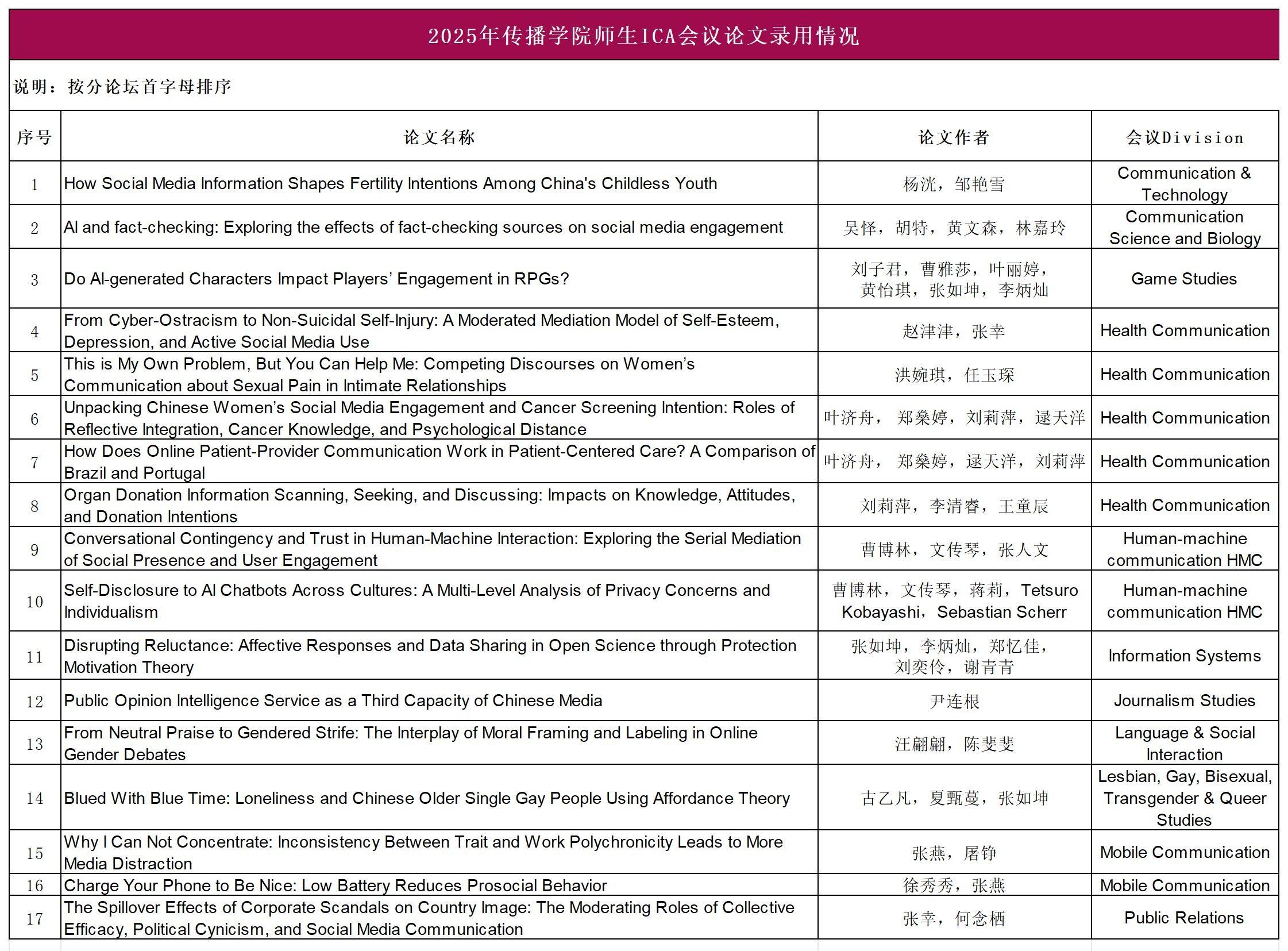 2025年第75屆國際傳播學會(International Communication Association,簡稱ICA)年會論文評審結果揭曉,深圳大學傳播學院共有17篇學術論文獲正式錄用,創歷史佳績。入選論文聚焦新聞學研究、公共關系學、新媒體研究、人機交互、健康傳播、性別研究、社會心理與行為研究等學科領域。值得一提的是,其中多篇成果由學院教師與研究生、本科生共同參與完成,彰顯學院在科研創新與人才培養方面的成效。學院將持續深化“有組織的科研”機制建設,拓展國際合作網絡,助力更多師生的論文問鼎國際頂級學術平臺。